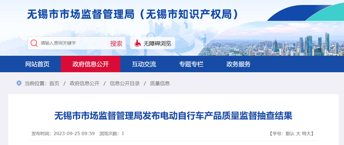 中国质量新闻网讯 据江苏省无锡市市场监督管理局网站2023年9月25日消息,2023年度,无锡市市场监督管理局对电动自行车产品质量进行了监督抽查,共抽查产品50批次,不合格产品6批次,不合格发现率为12.0%。