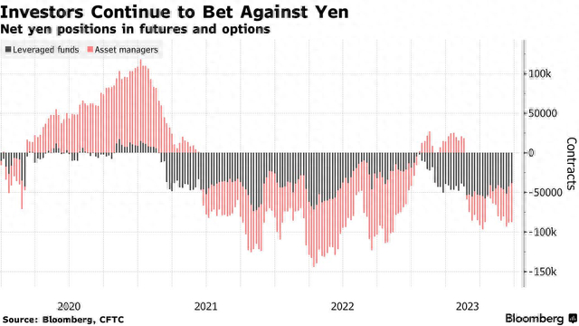 受日本央行政策影响,日元的隐含收益率低于零,成为投资者买入高收益货币的首选资金来源。根据美国商品期货交易委员会(CFTC)的最新数据,对冲基金和资产管理公司上周均持有日元净空头头寸。