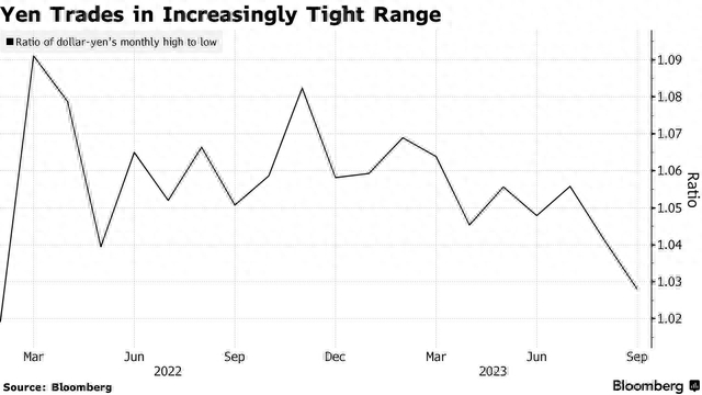 尽管美元兑日元周一早些时候触及10个月来的最高点,但美元兑日元9月内最高点和最低点之间的差距仅为2.8%,7月份,日本央行出人意料地调整了其YCC政策,当时这一区间几乎较9月翻了一番,达到5.6%。