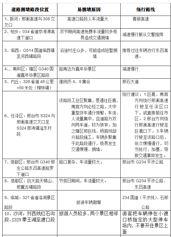 受大流量影响易造成缓行路段:京港澳高速360-375KM、388-400KM,大广高速北京方向1650-1675KM,青银高速560-572KM,东吕高速邢汾段437-440KM、465-468KM,邢衡高速0-3KM等路段将出现不同程度缓行。(邢台新闻传媒中心记者 冀文龙 通讯员 赵建春)