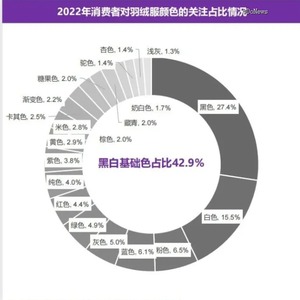 据艺恩营销智库的数据显示,在2022年消费者对羽绒服颜色的关注占比情况中,黑色占比27.4%,白色占比15.5%。故即便抛开“情绪价值”的内核,即便是在扭转消费者心智中,对黑、白两色的固有偏好,便是摆在鸭宝宝面前,尚需攻克的*道槛。