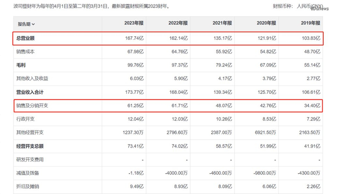 据其2019年-2023年年报显示,销售及分销开支费用从34.40亿元,一路攀升至61.25亿元,与之对应的是,总营业额从2019年的103.83亿元攀升至2023年年报中的167.74亿元。