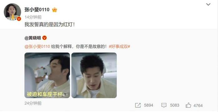 为了配合剧宣传,黄晓明和张小斐在微博隔空喊话。