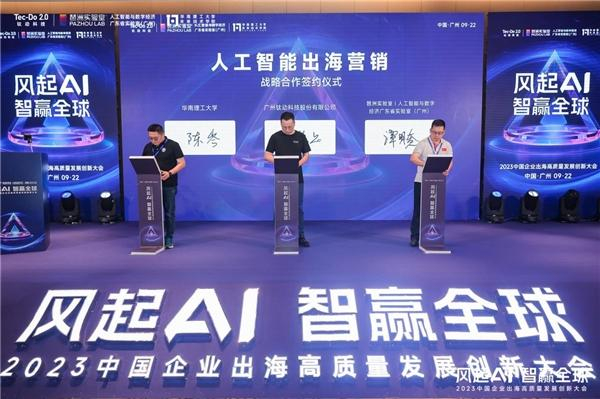 签约环节,钛动科技AI产品负责人陈德品博士、华南理工大学未来技术学院陈岑教授和琶洲实验室科学家谭明奎教授一同上台签字,正式启动“人工智能出海营销战略合作”。