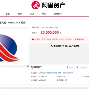 阿里资产官网显示,9月19日,起拍价为2000万元的腾邦控股股权的拍卖结果出炉。此轮竞价周期为一天,仅有2人报名,但无人出价,最终流拍。