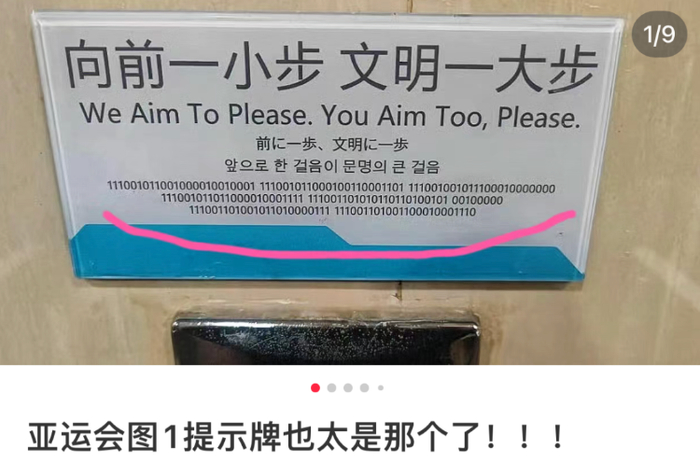 为了亚运会全情投入的杭州,就连文明标语,都用了中、英、日、韩四种文字,还附上了二进制写法。