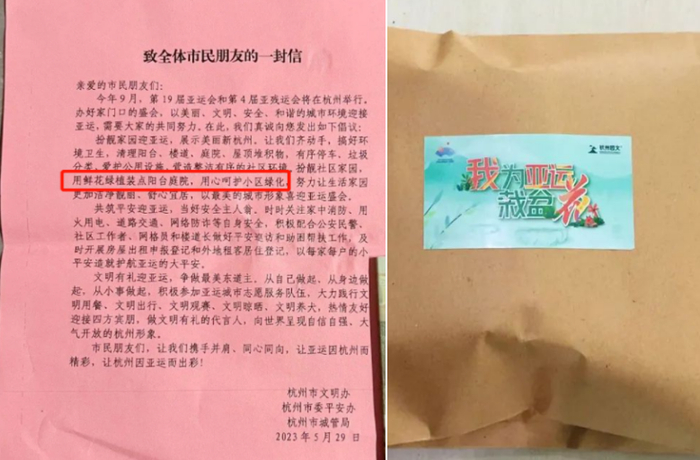 早在今年五月份,杭州就跟本地人发了一封信倡导:我为亚运栽盆花。