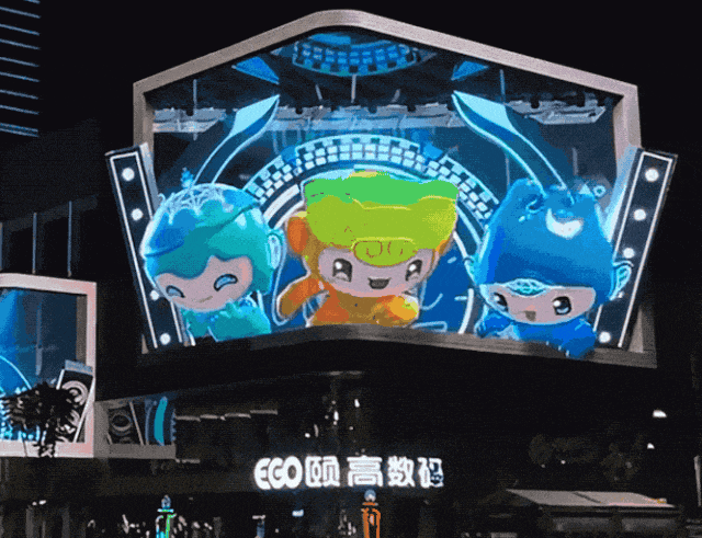 在街头巷尾、广场公园,杭州给足了吉祥物排面:马路上裸眼3D循环播放。