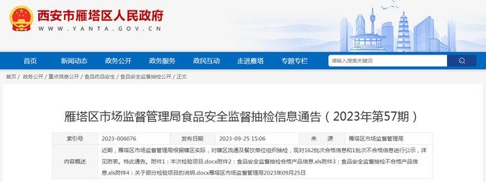 中国质量新闻网讯 近日,西安市雁塔区市场监督管理局发布食品安全监督抽检信息通告(2023年第57期)。