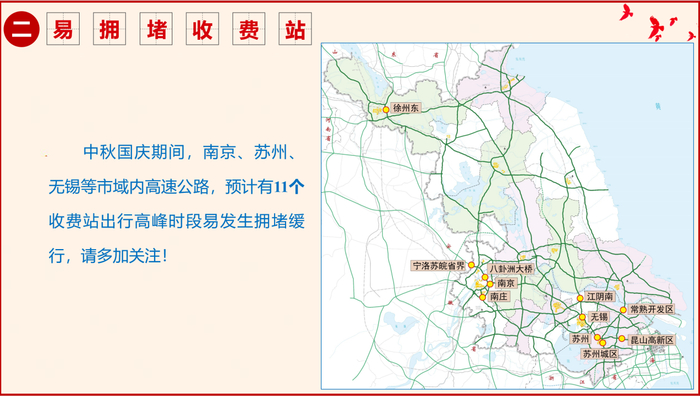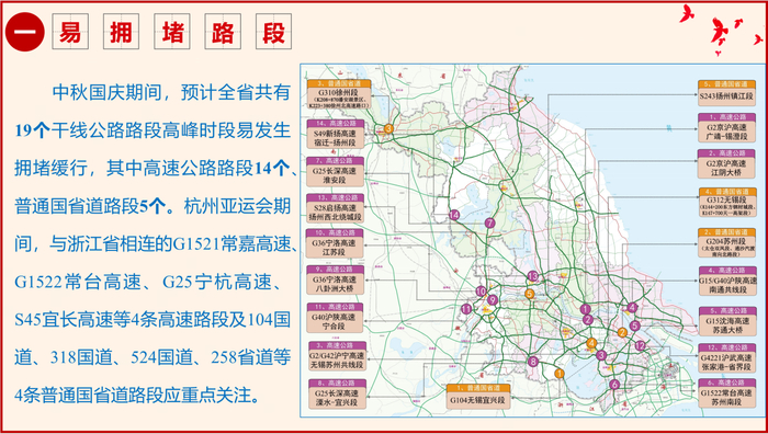 智慧交通大数据平台预测,江苏省将有19个干线公路路段高峰时段易发生拥堵缓行,其中高速公路路段14个,普通国道5个。杭州亚运会期间,与浙江省相连的G1521常嘉高速、G1522常台高速、G25宁杭高速、S45宜昌高速等4条高速路段及104国道、318国道、524国道、258省道等4条道路路段应重点关注。与此同时,双节期间,南京、苏州、无锡等市域内高速公路预计有11个收费站出行高峰时段,易发生拥堵缓行。叠加杭州亚运会交通高峰期,汾湖、平望、西坞、堰南4个高速公路邻浙枢纽应重点关注。