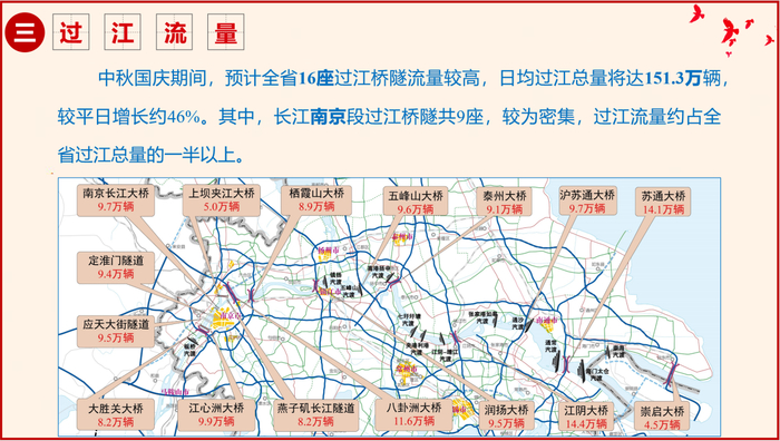 一方面,江苏省高速公路实行严禁危化品运输车辆通行管控政策,暂停所有路段养护施工作业,最大限度保障高速公路安全畅通。特别是在八卦洲、江阴、苏通、崇启4座过江大桥重点时段实施黄牌货车错时错峰出行管控,竭力解决客货车辆混行造成的通行不畅问题。另一方面,依托高速公路全程视频监控等科技信息化手段,江苏省公安交管部门将实时加强路网交通运行态势监测,按照“一点一策”“一段一案”要求,对重点路段提前引导、未堵先疏。双节期间,江苏将启动42个高速公路轻微事故快处快赔点,落实警保联动、同步出警、快处快赔、迅速清撤等措施,为广大群众提供“一站式”快速理赔服务。