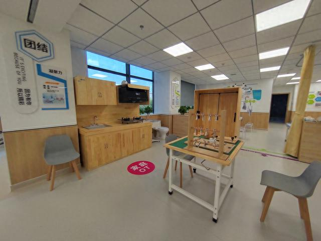 作为全区率先探索家庭ot应用的社区卫生服务中心,甘泉社卫分中心引入模拟家庭OT康复实训室。以家庭化的场景,让有康复需求的患者在日常生活的情景模拟中得到锻炼。实训室模拟了开门、晾晒衣物、洗菜做饭、上洗手间等生活场景,通过实操,提高功能障碍的患者日常生活活动自理能力和劳动能力,帮助患者回归家庭和社会。