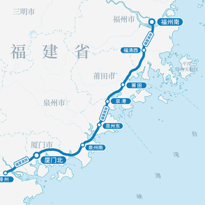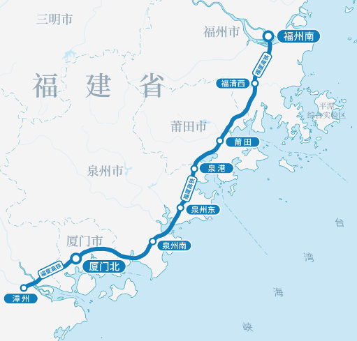 福厦高铁起自福州南站,经福建省莆田市、泉州市、厦门市、漳州市,接入漳州站。线路全长277公里,设计时速350公里。全线共设福州南、福清西、莆田、泉港、泉州东、泉州南、厦门北、漳州8座车站,其中漳州站为既有车站,福州南、莆田、厦门北站为改扩建车站,福清西、泉港、泉州东、泉州南站为新建车站。