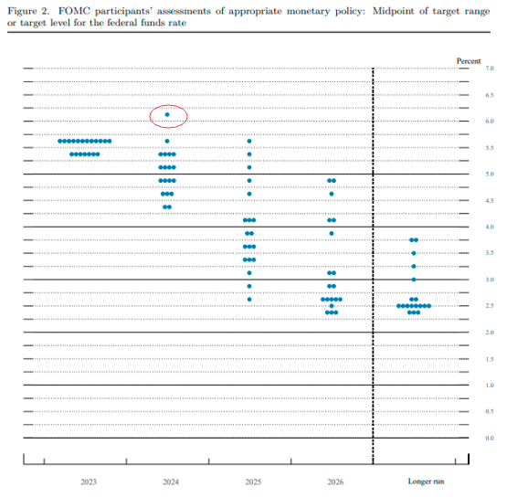 不过,尽管卡什卡利不出意外地依然位于美联储内的“鹰派阵营”中,但从其最新表态来看,他或许并不是美联储内的“新鹰王”——在上周公布的最新利率点阵图中,对明年的利率预测里曾有一位官员认为美联储明年不仅不会降息,还会进一步加息到6%以上。