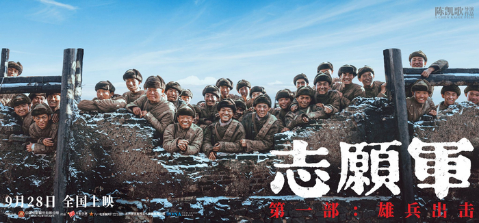与主题曲MV同时发布的,还有一组“无名战士”海报。海报上没有任何一个明星“熟脸”,只有一张张充满朝气的战士面孔,主创们也希望以此来致敬抗美援朝战争中的无名英雄。两张海报,一张是战斗打响前,战士们脸上带着笑容,满怀希冀;另一张则一扫明快的氛围,战士们脸上、身上都有战斗过的痕迹,表情也不再轻松。一明一暗的对比,突显战场的残酷,战士们在最青春的岁月,经历着最严苛的考验。