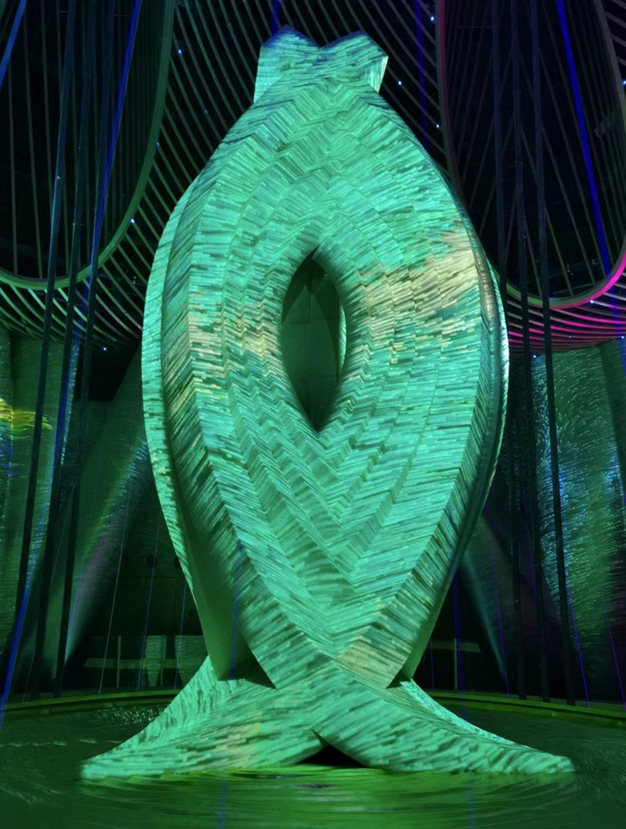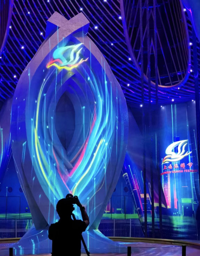 随着音乐的律动和光影变幻,上海旅游节LOGO、旅游节“飞鸟”造型等在上海之巅沉浸式艺术空间飞舞。十五分钟的光影秀中,“一江一河”游览、建筑可阅读、海派城市考古等上海文旅IP新形象,以及众多旅游节元素一一亮相。同时,上海城市旅游推广歌曲《我们的上海》主唱、力量之声组合艺术家与最高的沉浸式艺术空间共同演绎流光溢彩、“元”气满满的魔都上海。光影秀所在的上海中心大厦126层天时632艺术空间垂直高度583.4米,是目前最高的沉浸式艺术空间。在这一艺术空间内,480颗点光源投影至空间顶部,仿佛置身星空下;6种激光共136台,千变万化;244个扬声器和穹顶环形空间打造全息声效,让声音准确定位;当质量约1000吨的“阻尼器”随风摆动,便可触发为其量身定制的多组感应器设备,实时捕捉的动态数据激发数千组音乐、影像与光影矩阵的重新组合。通过科技与艺术融合,人与空间、与自然的实时互动,被转化为奇幻的光影视听盛宴。上海中心大厦商务运营有限公司总经理梅雪说,天气条件千变万化,“阻尼器”的摆动也不尽相同,因此每一次的光影秀体验堪称独一无二。