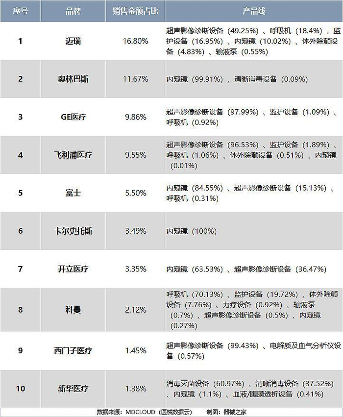 可以发现,在各类大额医疗设备采购订单中,迈瑞、开立等国内头部企业的身影频频出现,与西门子、GE、飞利浦等传统跨国医疗设备巨头同台竞技。以下是各个产品线销售第一的品牌: