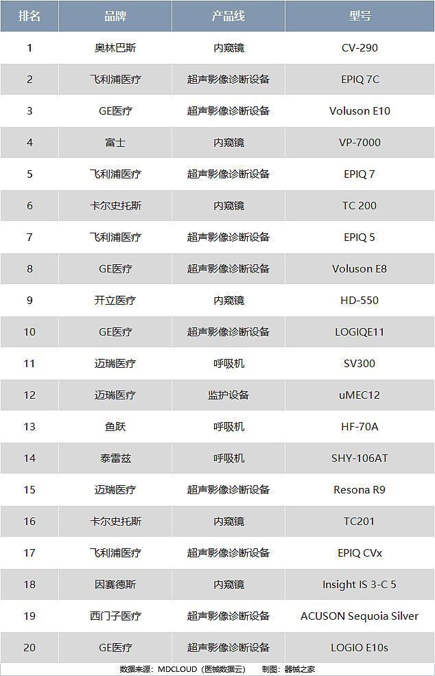 从型号来看,销售额排在第一位的是奥林巴斯型号为CV-290的内窥镜;其次是飞利浦型号为EPIQ 7C的超声影像诊断设备;排名第三的是GE医疗型号为Voluson E10的超声影像诊断设备。