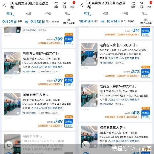 不仅仅在杭州,周边乃至全国地区的电竞酒店热度均高居不下。CG电竞酒店(绍兴鲁迅故里店)10月13日电竞五人房的房价为418元/晚,而9月29日的房价上涨至789元/晚,涨幅近90%,且当天的电竞单床房已显示订满。由此可见,电竞房的涨价规律是与节假日完全相吻合。