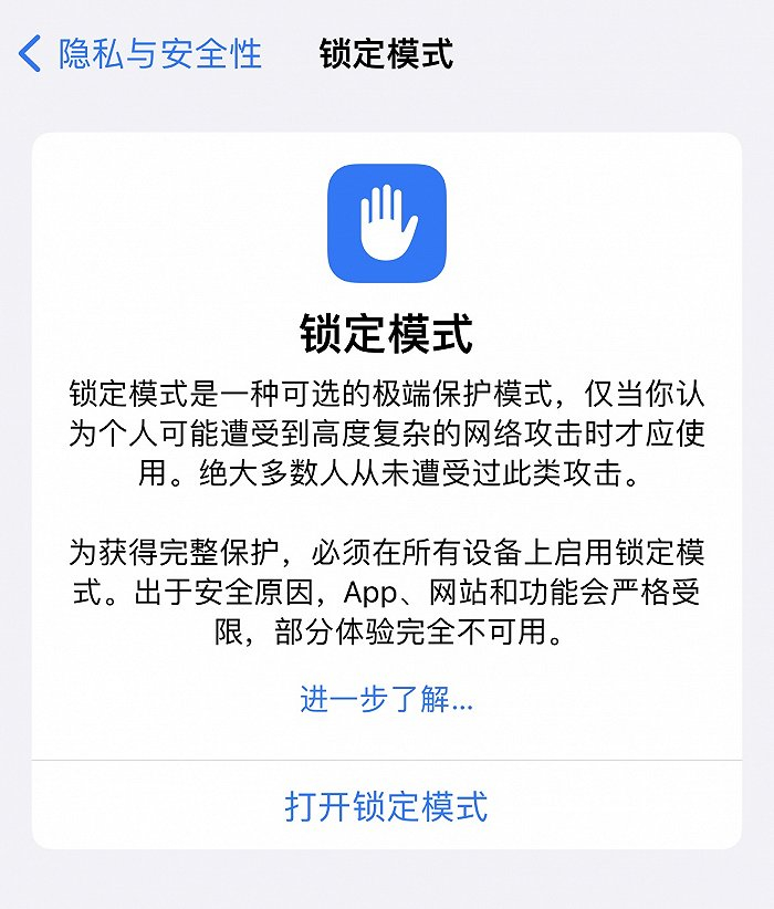 如今苹果又推出了进一步加码的数据保护能力,它甚至被官方介绍为“极端”——“锁定模式”——开启后,用户设备的部分功能会被关闭,例如你将无法接收任何陌生电话与短信,也无法主动向陌生号码发起联系。苹果公司代表强调,这一功能专为极少数个人用户设计,这些人可能会由于他们的身份或工作而被一些最复杂的数字威胁针对。大多数人从不会成为这类攻击的目标。