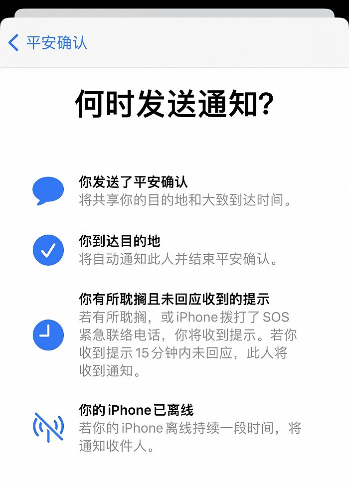 另一项能力“平安确认”已经可供国内用户使用,并受到了一些社交平台用户们的好评。该功能可在“信息”App中开启,在设置好目的地后,系统会自动检测用户是否抵达,并通过信息通知所选联系人。系统也会向用户发出询问,如未获得回应,系统会与用户选择的联系人共享实用信息,例如设备的准确位置、电池剩余电量、蜂窝网络状态及用户最近使用iPhone的时间等。