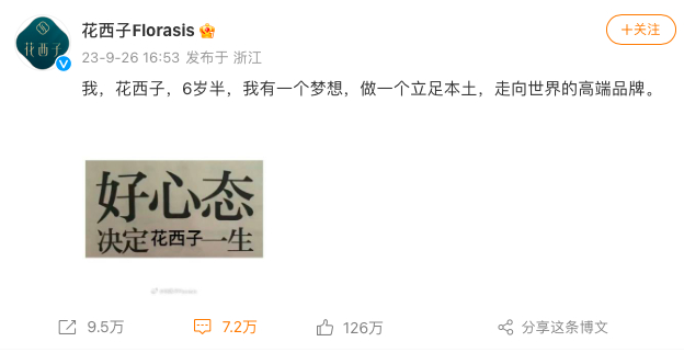 9月26日晚,“花西子发疯”话题引爆微博热搜。话题词之下,年仅6岁半的花西子告诉所有人,它有一个梦想——做一个立足本土,走向世界的高端品牌。并搭配了一张“好心态决定花西子的一生”的图片。