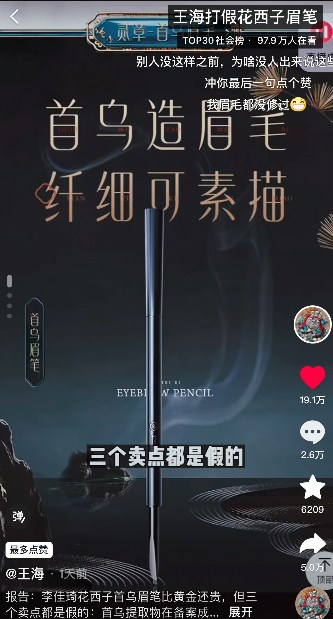 记者查询发现,从昨日起,职业打假人王海在社交平台上发布多条”打假花西子眉笔”视频,视频中王海称,花西子眉笔三个卖点都是假的。