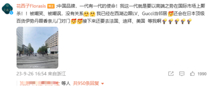 这一点在花西子前后的几次回应中多次提到,例如,花西子声称:“我这一代就是要以高端之势在国际市场上厮杀!我已经在西湖边跟LV、Gucci当邻居,还会在日本顶级百货伊势丹跟香奈儿门对门。”