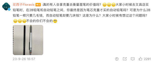 在提及关于眉笔价格的疑问时,花西子举例称:“真的有人会拿克重去衡量眉笔的价值吗? ”并用买2B铅笔和自动铅笔来做案例进行比较。
