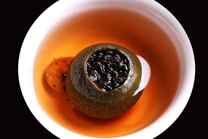 用掀盖冲泡法,柑果的耐泡程度好,果皮的味道与普洱茶汤融合较好,而且容易操作。