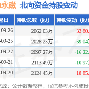 金力永磁(300748):9月26日北向资金增持33.8万股