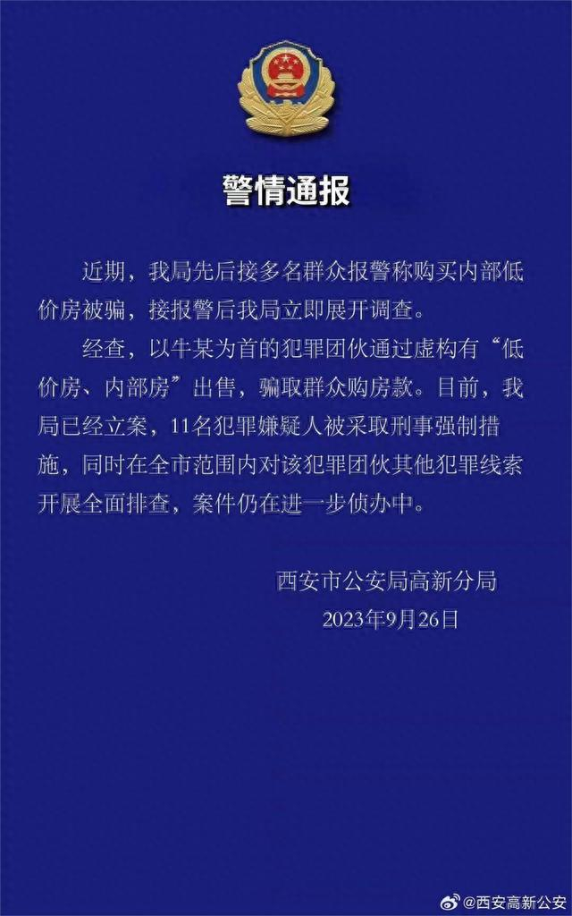 据西安市公安局高新分局9月26日发布的警情通报显示,近期,该局先后接多名群众报警称购买内部低价房被骗,接报警后该局立即展开调查。经查,以牛某为首的犯罪团伙通过虚构有“低价房、内部房”出售,骗取群众购房款。目前,该局已经立案,11名犯罪嫌疑人被采取刑事强制措施,同时在全市范围内对该犯罪团伙其他犯罪线索开展全面排查,案件仍在进一步侦办中。