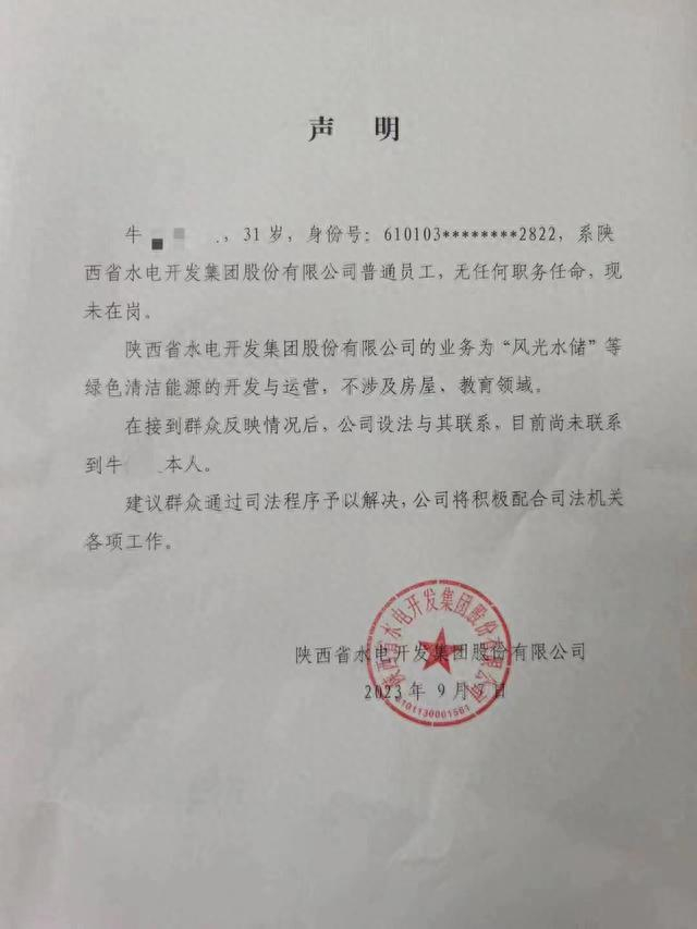 一份由陕西省水电开发集团股份有限公司2023年9月7日出具的声明上称,牛某系该公司普通员工,无任何职务任命,现未在岗。该公司的业务为“风光水储”等绿色清洁能源的开发与运营,不涉及房屋、教育领域。在接到群众反映情况后,公司设法与其联系,目前尚未联系到牛某本人。建议群众通过司法程序予以解决,公司将积极配合司法机关各项工作。