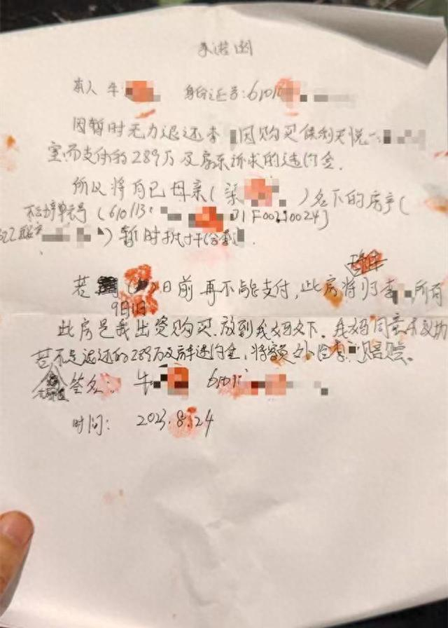意识到自己可能被骗后,李先生多次联系牛某,对方却告知他房款现在暂时退不出来,“她说钱被陕投给抽回去了,因为那边的项目比较急。”另外,牛某还给李先生出具了一份“承诺函”,上面写明牛某因暂时无力退还李先生因购买保利天悦一期×××室而支付的289万元及房东诉求的违约金,所以将自己母亲梁某名下的某处房产暂时抵押给李先生。并承诺若2023年9月1日前再不能支付,此房将无条件归李先生所有。