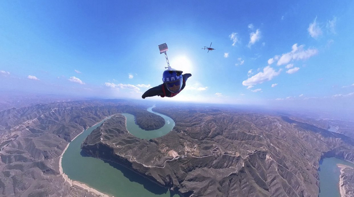 这一次,他选择了准格尔大峡谷附近的峡谷西岸为翼装飞行起点,以最高超200公里的时速直线飞行穿越黄河干流,于高空数百米处开伞,掠过明长城与黄河的“握手地”,在黄河东侧老牛湾国家地质公园的浅滩上降落。