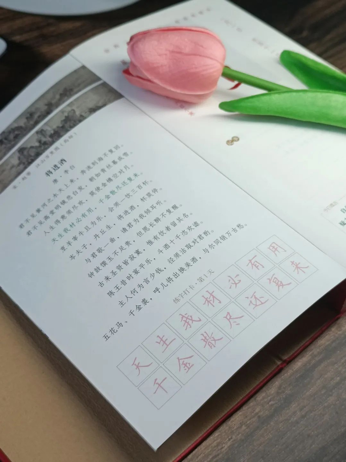 编辑团队从先秦到近代数千年的文化典籍里,努力打捞出中国人精神的伟大,一日一诗、一日一词,且都紧密围绕成长主题,如: