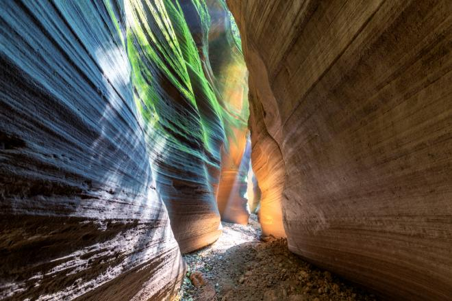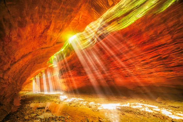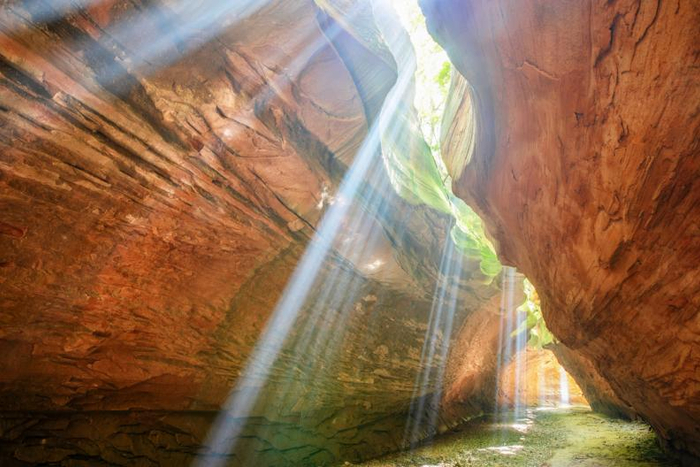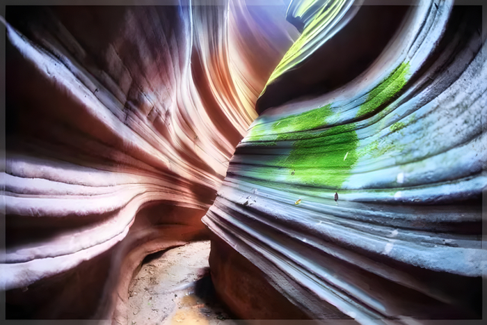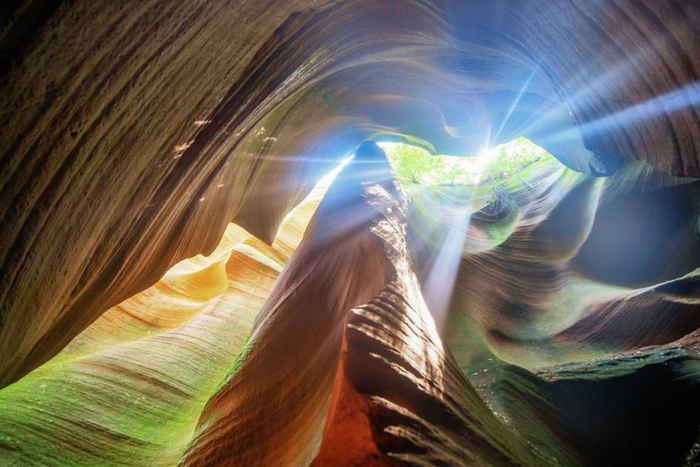 月牙谷:光影效果绝佳。浮光掠影、光柱随处可见,迈步向前如同在碧波间行走。峡谷全长约800米,高10米,该峡谷顶窄缝狭,腰阔底宽,独居穹庐式风格。履下平坦,回旋自如,谷内有“补天石”、“月牙铲”等微景观。