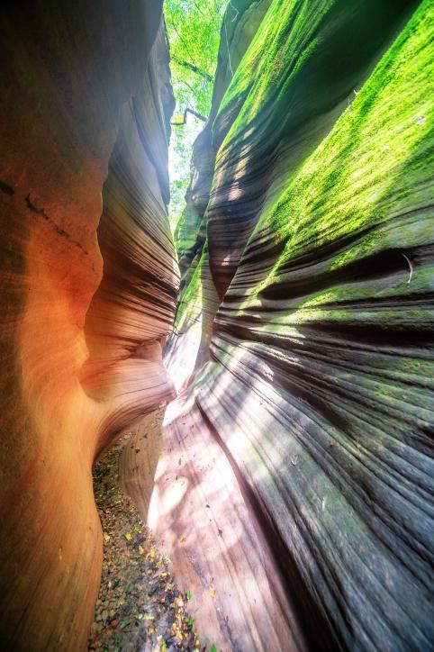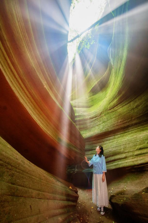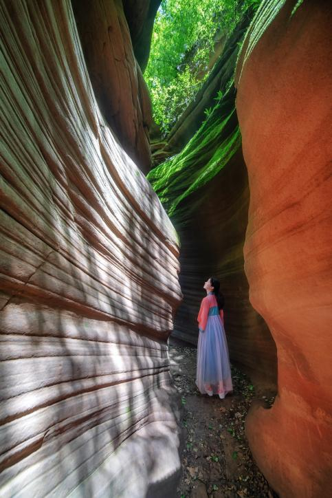 桦树沟:光影效果绝佳,是甘泉大峡谷的经典景观。峡谷全长1100米,蜿蜒悠长,常年溪流潺潺,崖壁绿苔茵茵,红色砂岩会根据阳光的变化,呈现出不同的颜色,五彩光晕流转,恍如隔世,有“人祖图腾”“时光隧道”“天外来宫”等微景观,被誉为“摄影天堂。