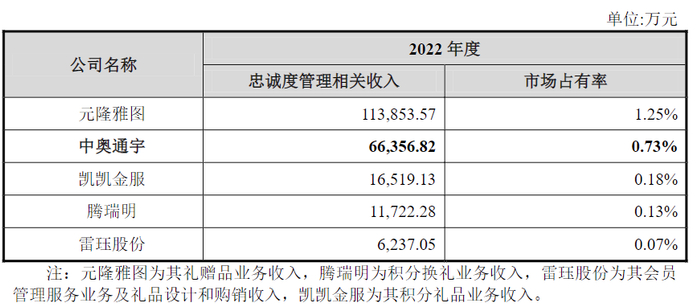 中奥通宇选取的可比企业分别为元隆雅图(002878.SZ)、腾瑞明(833660.NQ)、雷珏股份(834928.NQ)和凯凯金服(837070.NQ)。拿各自2022年年报来说,只有雷珏股份在主营业务中有用到“忠诚度管理”的相关表述,其他可比企业整篇几乎都搜不到“忠诚度”这个词语。早在2017年就登陆深市主板的元隆雅图,在其年报中较为接地气地将所属行业称为礼赠品行业,元隆雅图为该行业的第一家上市公司。