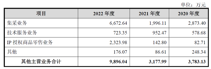 报告期内中奥通宇其他主营业务的增长源于集采业务和IP授权商品零售业务。集采业务主要系为客户提供营销宣传商品的批量采购、配送以及营销方案策划等服务(银行开卡礼、员工福利活动的方案策划、礼品供应等);IP授权商品零售业务系具有特殊属性IP商品的线下门店零售业务(如“冰墩墩”等特许纪念品)。