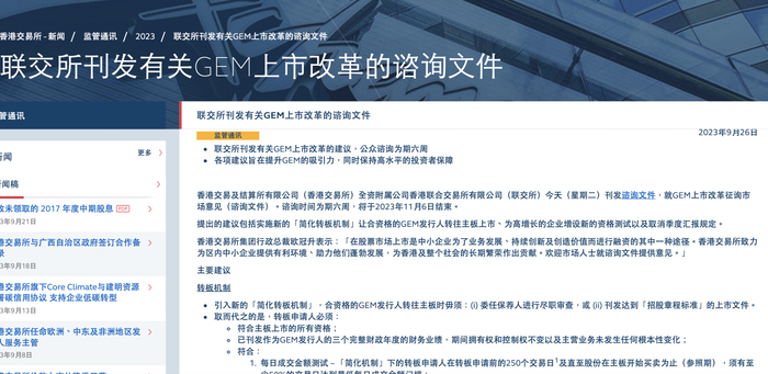 9月26日晚,香港联交所刊发咨询文件,就GEM上市改革征询市场意见,提出的建议包括实施新的"简化转板机制",让合资格的GEM发行人转往主板上市、为高增长的企业增设新的资格测试以及取消季度汇报等规定。