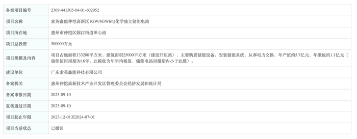 该项目是索英鑫能仲恺高新区1GW/4GWh电化学独立储能电站(下称“索英鑫能仲恺储能项目”)。广东省投资项目在线审批监管平台显示,9月10日,索英鑫能仲恺储能项目进行备案申报并于当天复核通过。也就是说,该项目从备案到撤回,时间不到20天。