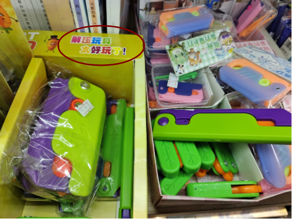 昆明的杨女士也发现最近女儿在玩“萝卜刀”。其女儿说,学校门口的文具店、小商店都有卖,同学们都在玩,“帅气出刀,唰唰唰”。杨女士的女儿说,“萝卜刀”有很多种规格,大的有手臂那么长,迷你的就巴掌大,还有带夜光的。
