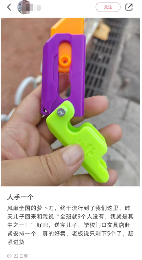 记者注意到,在某平台上,有多位云南家长发帖称,学校门口的文具店都有卖“萝卜刀”的,自己的孩子都跟风买了。