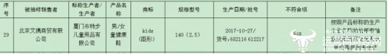 其中,标称由北京艾携商贸有限公司销售的、厦门市特步儿童用品有限公司生产的男/女童健康鞋,经检验为不合格,不合格项为“标识”。涉及相关产品规格型号为140(2.5),生产日期为2017-10-27,货号为682116 612217。