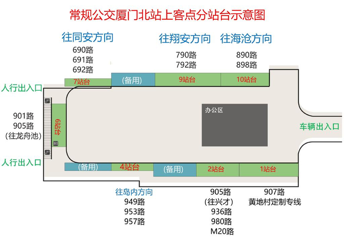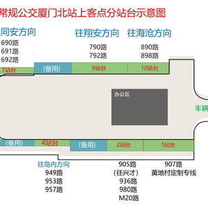 该枢纽站启用后,常规公交的“厦门北站”将由现状珩圣路的临时公交场站迁址至新建的枢纽站,涉及395路、690路、691路、692路、790路、792路、890路、898路、901路、905路、907路、936路、949路、953路、957路、980路、M20路、黄地村定制专线等18条线路,并同步调整枢纽站上客区的分站台停靠方案。