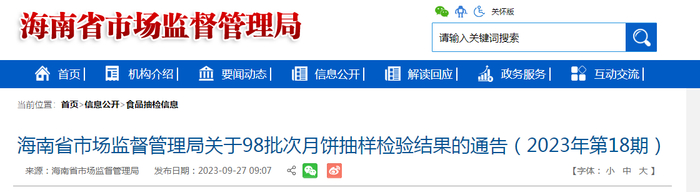 中国质量新闻网讯 2023年9月27日,海南省市场监督管理局网站发布关于98批次月饼抽样检验结果的通告(2023年第18期)。