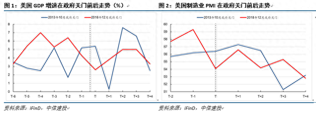 由于财政支出和公共服务的部分暂停,政府关门将对经济、市场、社会和政治等均会产生一定影响。经济方面,若持续时间较长,关门对GDP和PMI均会造成较大短期压力。典型的例子是2018年底,关门时间超过1个月,当时GDP增速、制造业PMI、以及政府非农就业均出现明显下降,关门结束后开始修复。但是,由于政府相关支出只是延迟而非取消,“必需的”服务业会照常提供,这些冲击只在短期出现,且如果持续时间不长(政府关门的平均持续时间是8.91天),冲击体现也不明显,例如2013年。