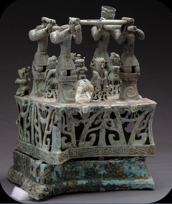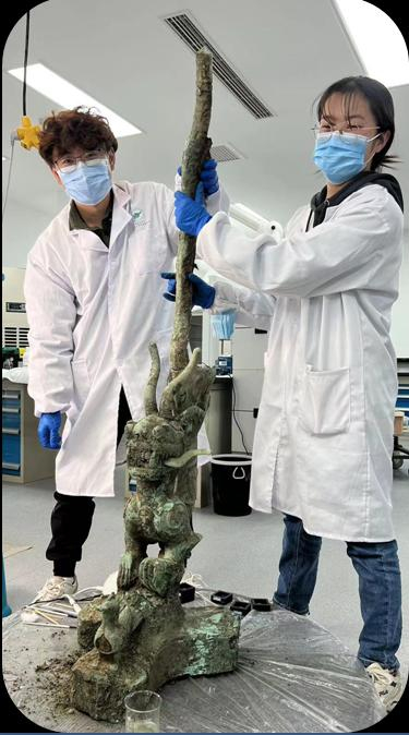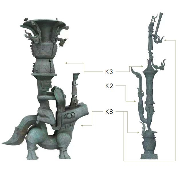 在这些青铜器中,著名的立人大神兽、倒立撑罍顶尊神像,青铜持龙立人像和青铜杖形器,都与2号、3号坑中的其他“组件”拼对成功,变身成更加高大奇绝的“复合体”。同样吸睛的青铜大神坛,也来自8号坑。