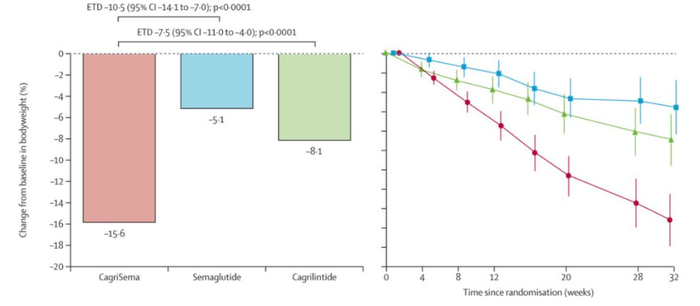 今年6月,诺和诺德披露了CagriSema对2型糖尿病患者的疗效和安全性的研究。结果表明,与单独使用司美格鲁肽或卡格列肽相比,CagriSema不仅改善了血糖控制,而且还导致体重更为明显地减轻。